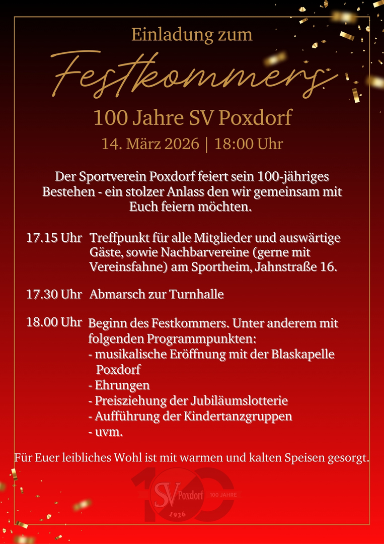 Mit dem großen Feuerwerk am 5. Januar startete der SV Poxdorf in sein Jubiläumsjahr. Der Festkommers knüpfte nun nahtlos daran an und im Mai soll das große Fest bei hoffentlich bestem Wetter den Höhepunkt bilden. Die Festleitung liegt dabei in den Händen von Otto Werner und Dominik Frister, die gemeinsam mit ihrem Festausschuss bereits intensiv an den Vorbereitungen arbeiten. Vom Schafkopfturnier über einen stimmungsvollen Vatertag mit Blasmusik bis hin zu Rockabend und Mallorca Party ist für jeden etwas geboten. Den Abschluss bildet ein traditioneller Festsonntag mit Gottesdienst, Frühschoppen, Festumzug und Festausklang.