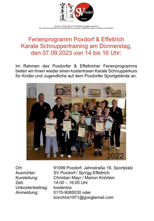Auch in diesem Jahr beteiligte sich die Poxdorfer und Effeltricher Karateabteilungen am Ferienprogramm. So trafen sich am 11.9.2025 in Poxdorf die Kinder und übten fleißig den Einstieg in das fernöstliche Karate. Die Karatemeister Marion Knörlein und Christian Mayr unterrichteten mehrere Stunden Grundschule, richtiges Fallen und die Abwehr von Übergriffen. Diese kostenlosen Aktivitäten gehören zu unserer Jugendarbeit. Am Ende schafften alle Aktiven ihre Urkunde. Der Schulanfang ist die beste Gelegenheit mit dem Karatetraining anzufangen.