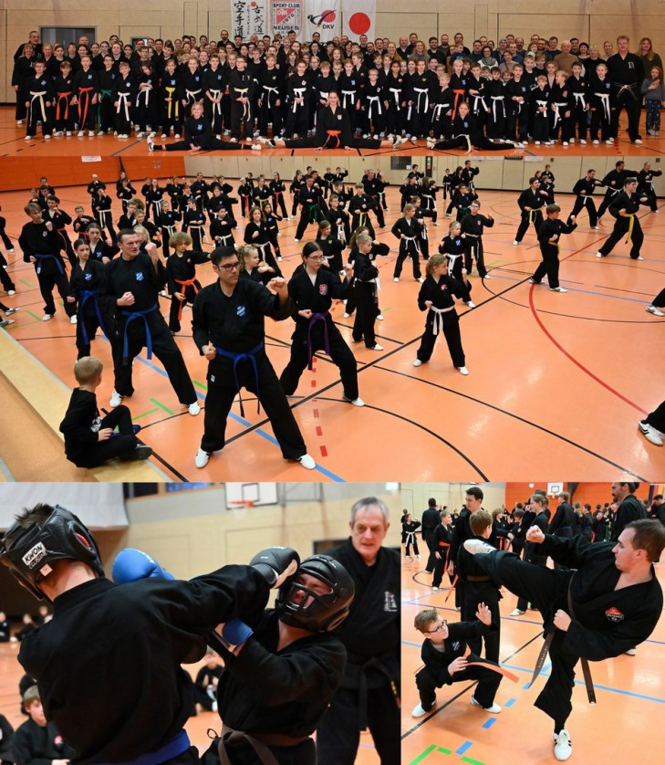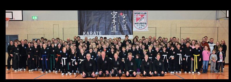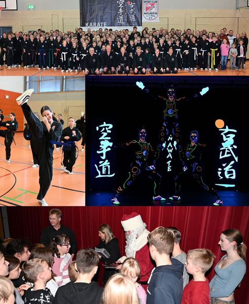Am 7.12.2024 trafen sich in Eggolsheim viele Mitglieder unserer Karate Vereine, um mit den Meistern Herrn Thorsten Lehmann und Helmut Stadelmann Okinawa-Karate zu üben. Thorsten Lehmann mit Team organisierten das Treffen und die Halle war richtig voll. Von der Grundschule über Partnertraining, Freikampf, Bruchtest, Selbstverteidigung und Kata wurde alles Prüfungsrelevant geübt und die vielen Zuschauer sparten nicht mit Applaus. Nach dem Mittagessen wurde es ernst und die Prüfungen begannen. Sabrina Hofmann hatte sich bestens vorbereitet. So prüften wir bis in die Abendstunden und alle freuten sich schon auf unsere Abendveranstaltung im Veranstaltungssaal der Eggerbachhalle. Nach dem Besuch des Nikolauses und der Bescherung kamen die Ehrungen. Hier war Stadelmann sichtlich gerührt, wurde er doch für seine 25 Jahre Karateaktivitäten in der Fränkischen Schweiz gelobt. Zugeschaltet aus Italien hielt 1. Bürgermeister Herr Claus Schwarzmann seine Laudatio. Auch die Vereinsleitung der DJK SC Neuses vertreten durch 1. Vorstand Herrn Peter Roppelt lobten die ehrenamtliche Karatearbeit. Zum Schluss wurden endlich die Prüfungsergebnisse mit Übergabe der DKV-Ausweise und Urkunden verkündet und somit gingen alle glücklich, aber müde und ziemlich spät nach Hause.