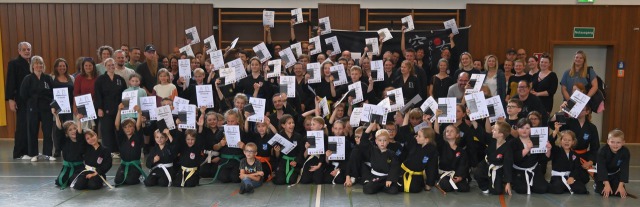 So vermeiden wir Enttäuschungen. Gleichzeitig wurden auch die Leistungen von bereits höheren Danträgern kontrolliert, da dieses und nächstes Jahr Meisterprüfungen anstehen. Das Bild zeigt einen Teil der glücklichen Teilnehmer. Der gelungene Samstag klang noch mit einem leckeren Abendessen im Vereinsheim aus.
