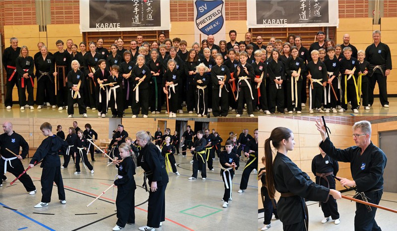 Das Karate Ehepaar Lehmann organisierte den Lehrgang in der Pretzfelder Schulturnhalle. Wir waren ausgebucht und es wurden mit allen erlaubten, historischen Kobudo Gegenständen fleißig geübt, um sich bis zum Schluss auf die anstehenden Vorprüfungen vorzubereiten. Sai, Bo, Hanbo, Tankon, Tessen, Kama und Tonfa mussten beherrscht werden. Nicht alle haben die Prüfung bestanden, trotzdem waren Helmut Stadelmann mit seinem Team und der aus München eingeladenen Prüferin Sabrina Hofmann sehr zufrieden. Die Dojo Leiter Stadelmann, Hofmann, Lehmann, Mayr, Knörlein und Knauer bereiten nun ihre künftigen neuen Karate-Meister auf ihre Prüfung im November in Weilersbach und die vielen Farbgurte auf die Prüfung im Dezember in Eggolsheim vor.