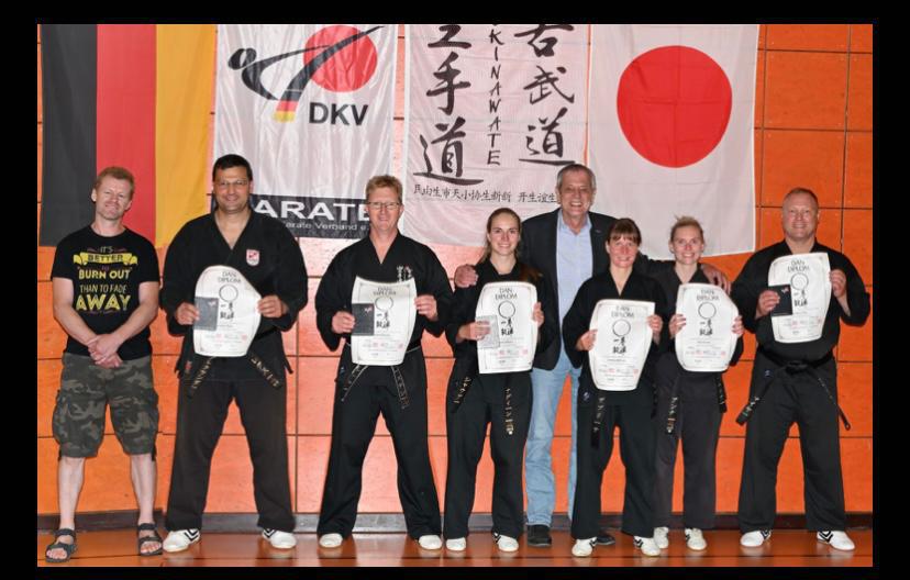 Bei der diesjährigen, wegen Corona oft verschobenen Meisterprüfung des Deutschen Karate Verbandes, erhielten 6 Prüflinge aus den Händen der DKV Prüfer H. Reiner Thiemel und Helmut Stadelmann ihre Ernennungs-Urkunden. H. Thiemel merkte in seinem Schlusswort an, dass das in allen Facetten gezeigte Karate, über den geforderten Prüfungsvorgaben lag. Nach stundenlangen Prüfungen erkämpften sich H. Alexander Regus Dojo Neuses den 2. Dan, H. Thorsten Lehmann Dojo Neuses den 4. Dan, Fr. Nadine Schauer Dojo Neuses den 1. Dan, Fr. Sabrina Hofmann Dojo Weilersbach den 5. Dan, Fr. Anna Knauer Dojo Weilersbach den 4. Dan und H. Christian Mayr Dojo Poxdorf den 1. Dan. Helmut war sichtlich stolz auf seine Karateka die alles von ihm gelernt und bestanden haben. Das Bild zeigt von links: H. Thiemel, Alexander, Thorsten, Nadine, Helmut, Sabrina, Anna und Christian. 05.11.2021