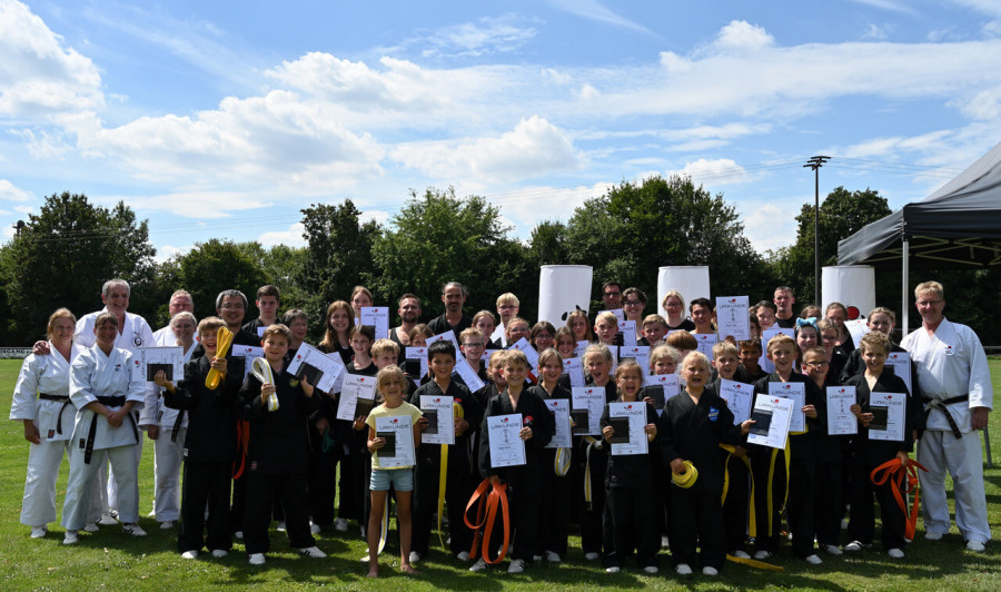Wie schon seit vielen Jahren veranstalteten die Okinawa-Karateka aus der Fränkischen Schweiz ihr dreitägiges Zeltlager bei der DJK Neuses e.V... Nach einer kurzen Ansprache von Helmut Stadelmann und einer Schweigeminute für unseren verstorbenen Freund Wolfgang Tuffner begann die Einschreibung der angereisten Teilnehmer. Der Familie Lehmann oblag die Gesamtorganisation und unser Thorsten meisterte dies wie immer hervorragend. Bei wechselhaftem Wetter übten das gesamte Wachende vor Ferienbeginn, die großen Gruppen im Freien und auch in der Turnhalle in Eggolsheim. Ziel war die Prüfung des Deutschen Karate Verbandes und Bayerischen Karate Bundes am Sonntag. Unsere Prüfungsbeauftragte Sabrina Hofmann reiste extra aus Leipzig an um in Abstimmung mit den Prüfern vor Ort, diese Mammutaufgabe zu stemmen. Vor vielen Zuschauern wurden alle Formen des Karate gezeigt. Das Bild zeigt die Prüflinge und nach über 50 Stunden voll mit Aktivitäten ging es in die großen Ferien. Während der Sommerferien trainieren wir immer am Donnerstag ab 17 Uhr am Sportplatz Neuses und bei Regen in unserem Neuseser Dojo.