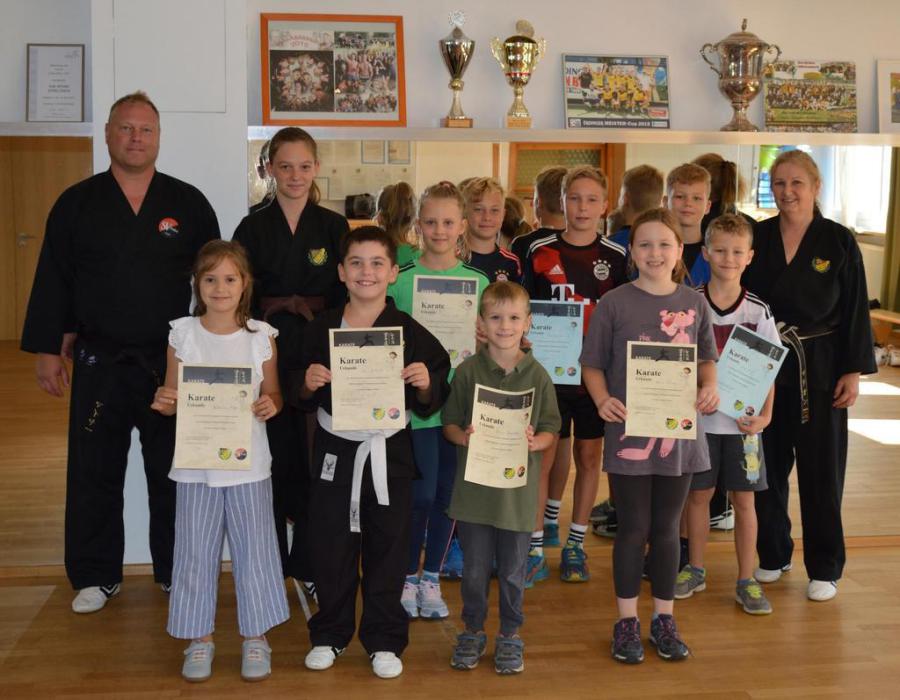 Der Prüfungstermin am letzten Wochenende im September war schon lange geplant und offiziell vom Deutschen Karate Verband ausgeschrieben. Somit trafen sich nach jahrelanger Vorbereitung eine kleine Schar Prüfungswilliger in der Weilersbacher Turnhalle mit den DKV-Prüfern Helmut Stadelmann und Sabrina Hofmann, welche extra aus München angereist ist. Und die lange Anreise hat sich gelohnt, wie Helmut und Sabrina gleich merkten. Die Vorbereitung, die Leistungsbereitschaft und die gezeigten Elemente Kihon, Kata, Kumite und Goshin aus dem Okinawa-Karate waren es wert honoriert zu werden. Somit bestanden alle Prüflinge anstandslos ihre nächste Karatestufe.