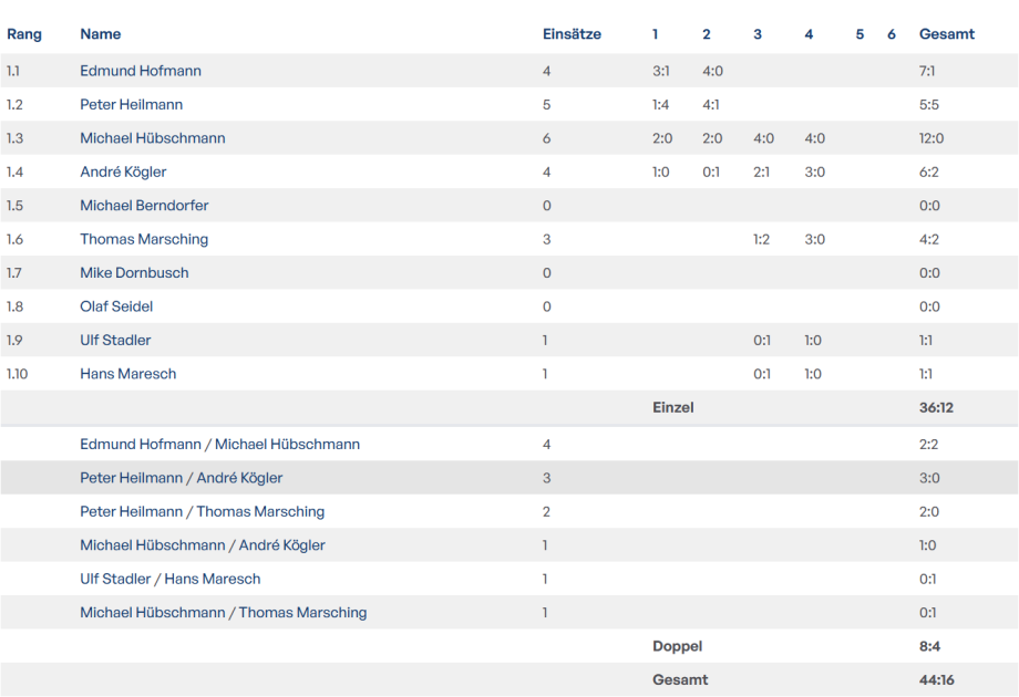 Auch Michael Hübschmann bestätigte seine starke Verfassung und steuerte zwei klare 3:0-Siege bei. Damit sorgte er entscheidend für den komfortablen Vorsprung. Peter Heilmann konnte zwar im Einzel