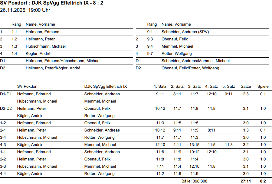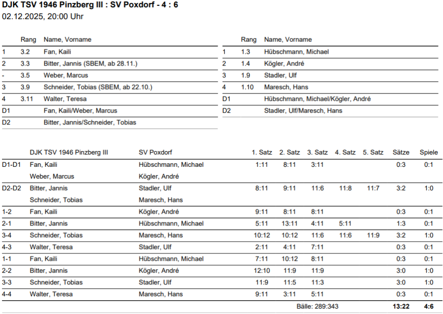 Pinzberg hatte mit zwei Jugendspielern aufgestellt, was den Poxdorfern nicht unbedingt in die Karten spielte. Dank der Erfahrung konnte der Auswärtssieg dennoch eingefahren werden. Nächster Spieltag für Poxdorf ist am Mittwoch, 10.12.2025 gegen Eggolsheim