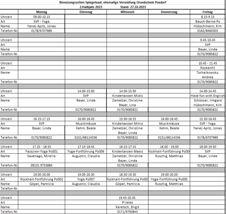 Belegungsplan für die Schulturnhalle Poxdorf